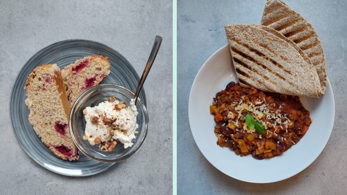 Domowa chałka z malinami, a na obiad Chili Sin Carne z soczewicą.